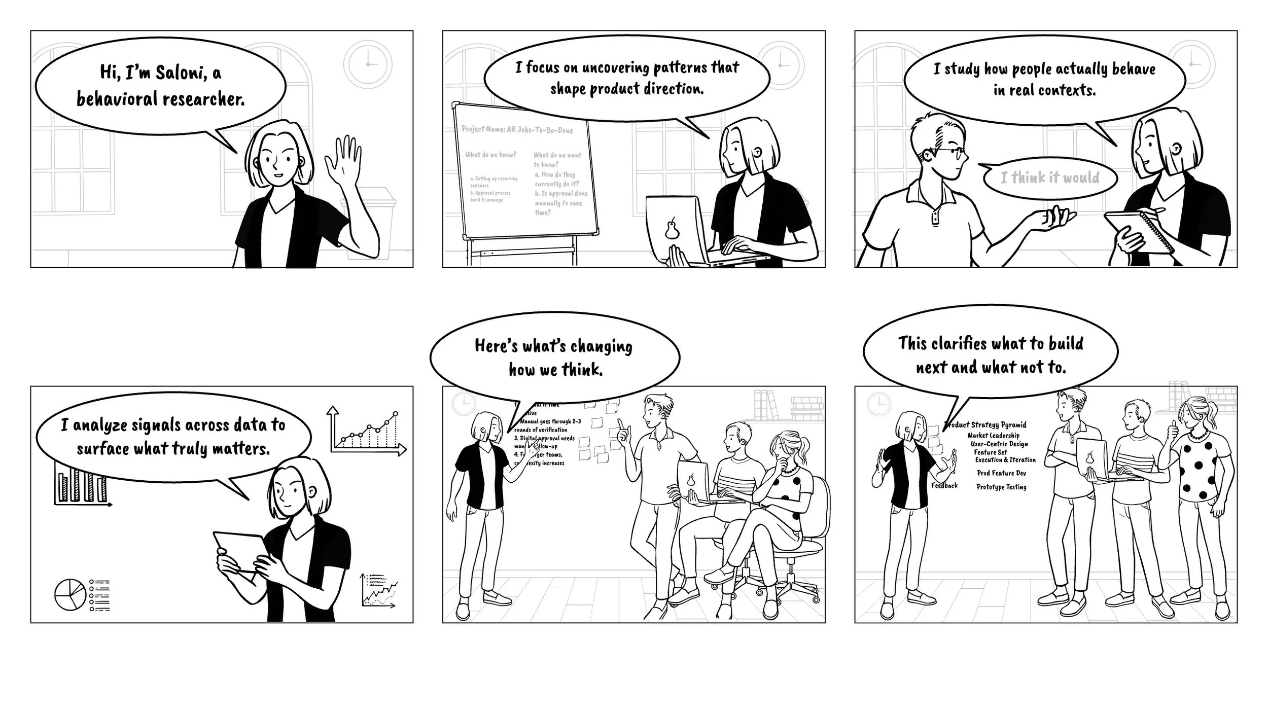 Born and raised in India and now based in the US, I’m a behavioral researcher with experience across fintech, software, manufacturing, and AI-driven products. My work focuses on how people think, decide, and behave within complex systems, and translating those patterns into clearer product direction.